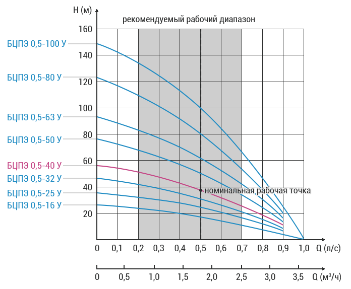 Оптимальный диапазон эксплуатации аппарата Водолей БЦПЭ-0.5-40У по расходу находится в пределах от 0.7 м3/час до 2.5 м3/час. Незаменимый вариант для коттеджей и домов на одну семью. В качестве водоподъёмной трубы рекомендуем применять напорную трубу ПНД с внутренним диаметром от 25 мм. Электронасос Водолей БЦПЭ-0.5-40У способен полностью удовлетворить ваши нужды, связанные водоснабжением или поливом.